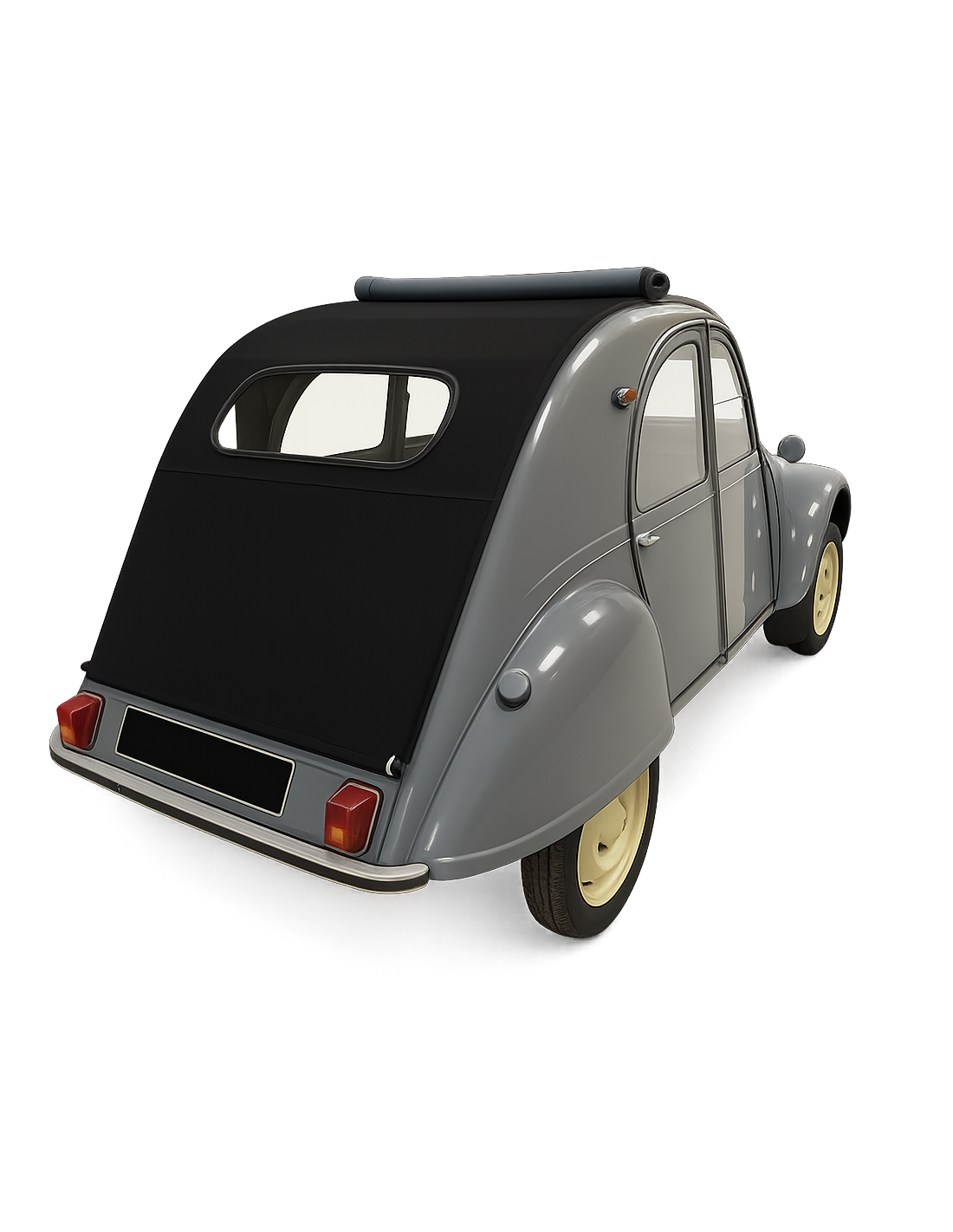 Capote longue pour 2CV anciennes (type A, AZ, AZL, 1949 à 1963), toile plastifiée gris anthracite avec petite vitre arrière, comme à l’origine.