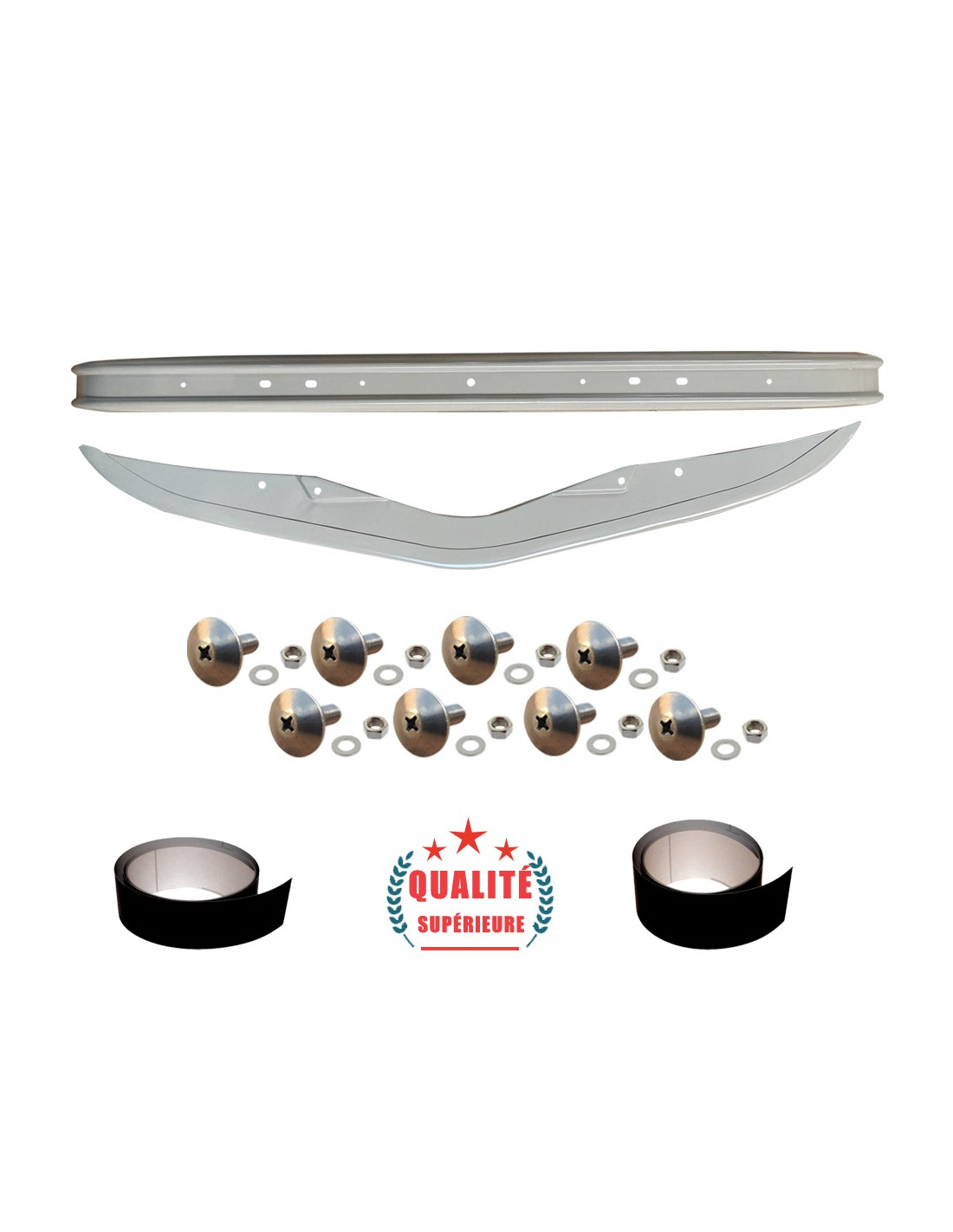Ce kit se compose d'un pare choc avant pour 2CV à partir de 03/1963 gris rosé, d'un pare choc arrière d'une hauteur de 9cm des adhésif avant de 25mm et arrière de 30 mm de haut et de 8 vis inox pour le montage.