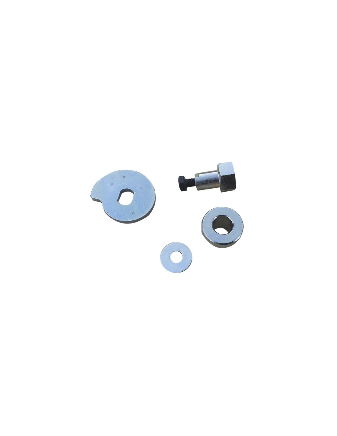 Composition du kit : un axe avec épaulement et tête hexagonale de Ø 14 avec boulon de fixation Ø 5 au pas de 80 en bout de filetage, entretoise et rondelle escargot permettant le réglage des mâchoires.