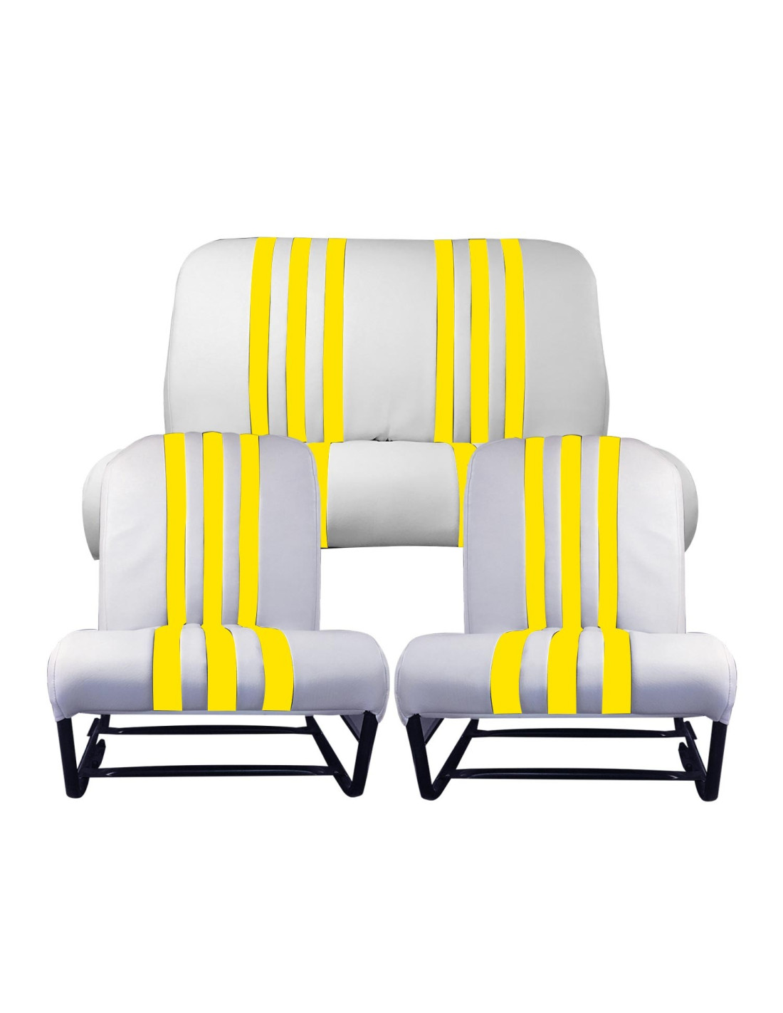 Ce kit se compose de 2 garnitures de Sièges avant symétrique et 1 garniture de banquette arrière . Les garnitures sont équipées de rabats latéraux. Coloris Blanc rayé Jaune. Nous vous conseillons de vérifier l'état de vos mousses et vos fonds de sièges ainsi que les anneaux en caoutchouc. Produit complémentaire Référence 1355A. Se monte sur 2cv6, Dyane 6.