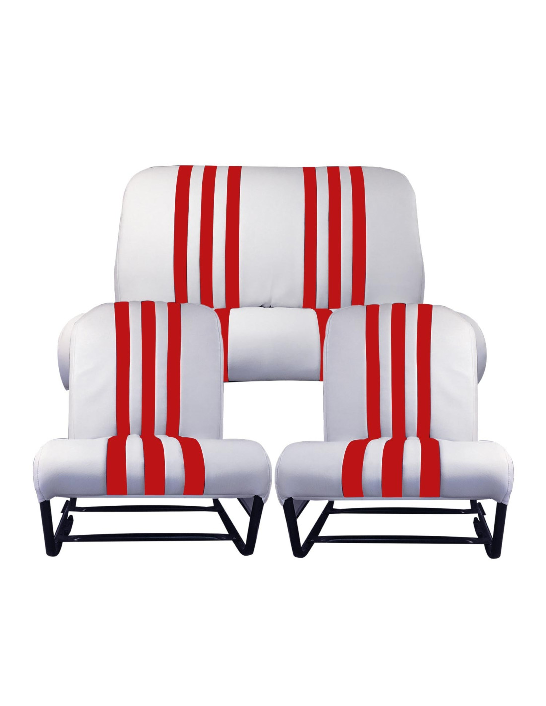Ce kit se compose de 2 garnitures de Sièges avant symétrique et 1 garniture de banquette arrière . Les garnitures sont équipées de rabats latéraux. Coloris Blanc rayé Rouge. Nous vous conseillons de vérifier l'état de vos mousses et vos fonds de sièges ainsi que les anneaux en caoutchouc. Produit complémentaire Référence 1355A. Se monte sur 2cv6, Dyane 6.