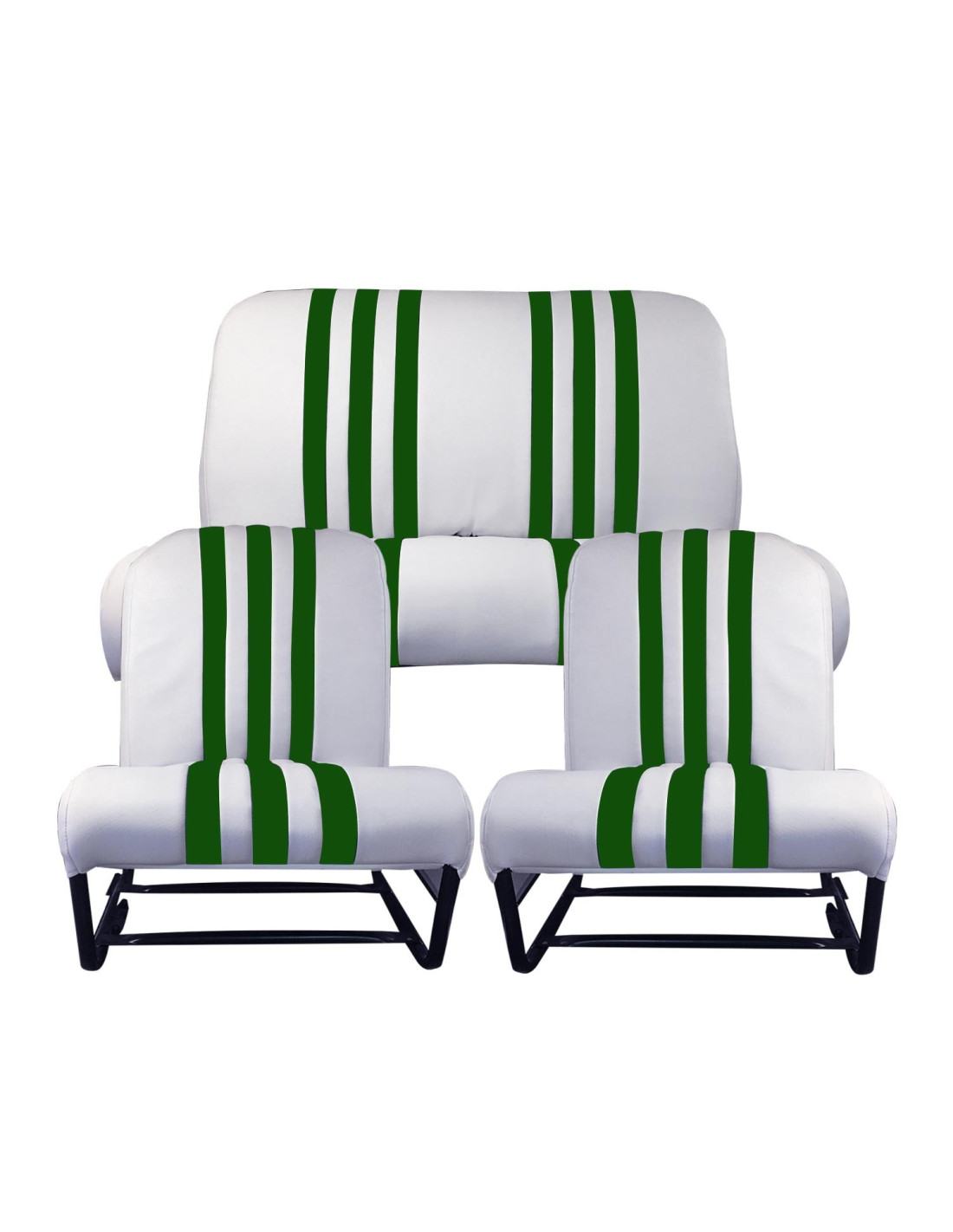 Ce kit se compose de 2 garnitures de Sièges avant symétrique et 1 garniture de banquette arrière . Les garnitures sont équipées de rabats latéraux. Coloris Blanc rayé Vert. Nous vous conseillons de vérifier l'état de vos mousses et vos fonds de sièges ainsi que les anneaux en caoutchouc. Produit complémentaire Référence 1355A. Se monte sur 2cv6, Dyane 6.