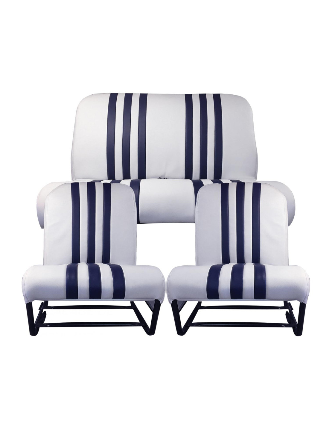 Ce kit se compose de 2 garnitures de Sièges avant asymétrique et 1 garniture de banquette arrière . Les garnitures sont équipées de rabats latéraux. Coloris Blanc rayé Bleu. Nous vous conseillons de vérifier l'état de vos mousses et vos fonds de sièges ainsi que les anneaux en caoutchouc. Produit complémentaire Référence 1355A. Se monte sur 2cv6, Dyane 6.