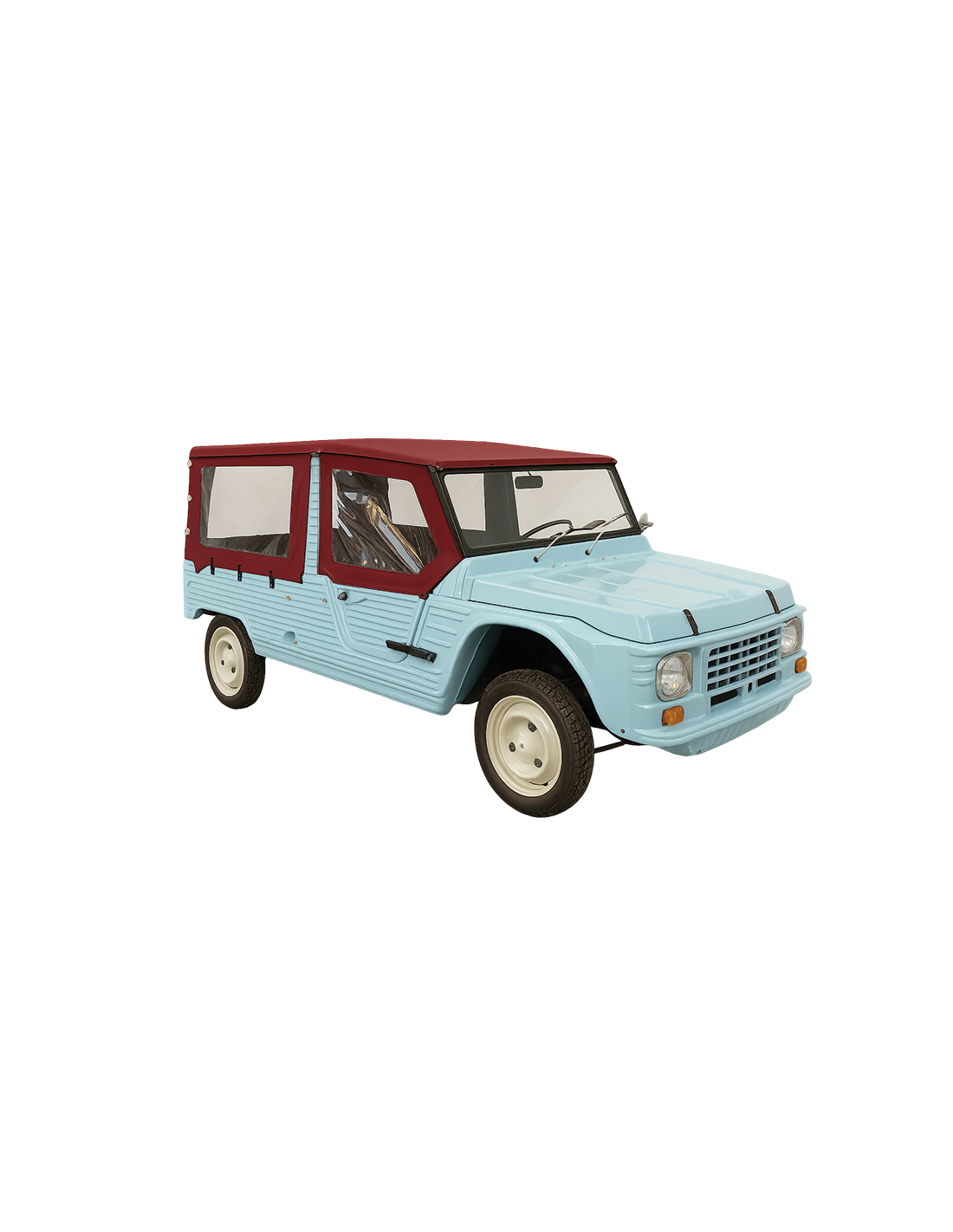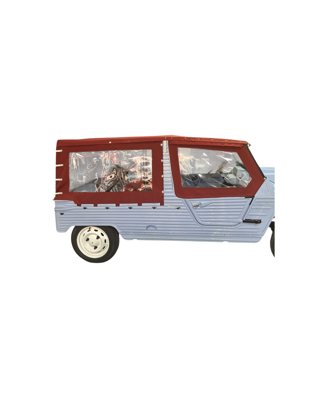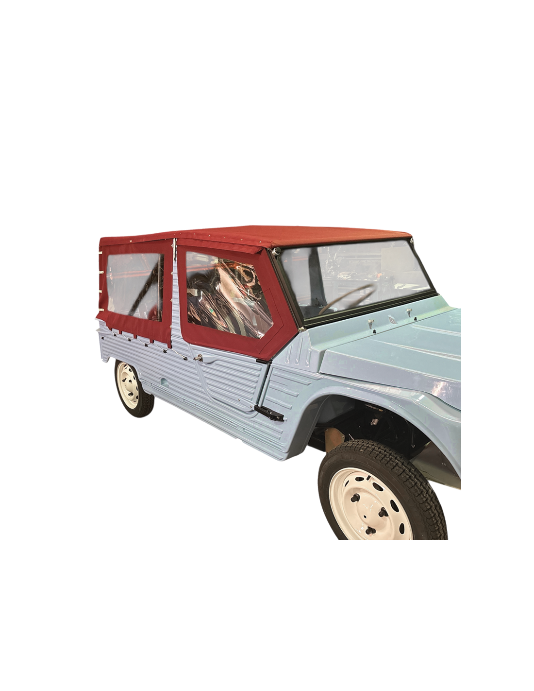 La toile coton-polyester, associée à des fermetures zippées discrètes, des coutures assorties à la toile, et des transparents 80/100ème, confère à votre Méhari une esthétique vintage chic et soignée, sans compromis sur la durabilité.